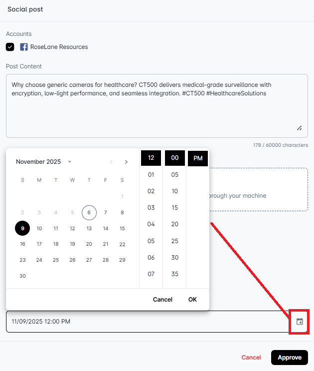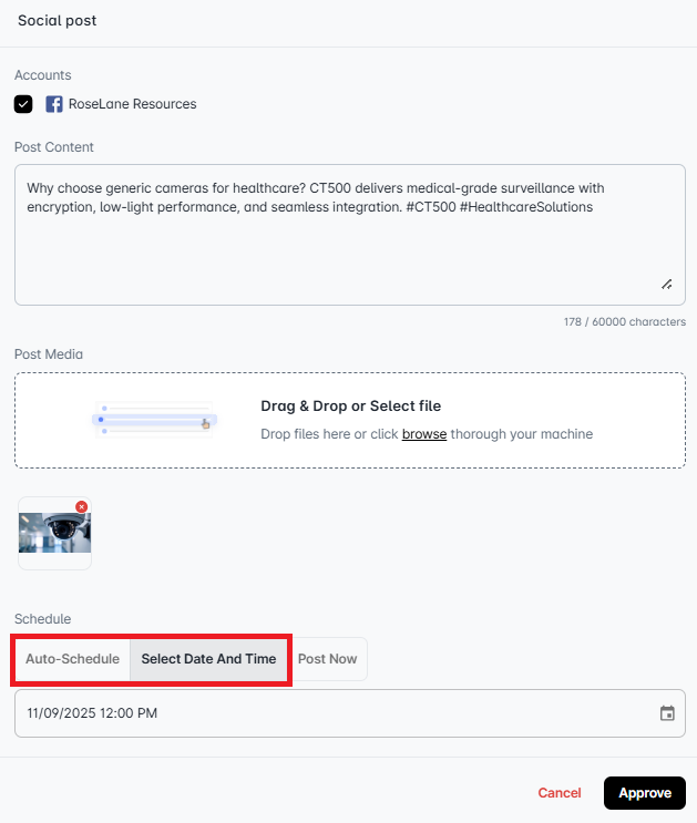 You can schedule a social media post to be published to your social media account(s) on a future date.