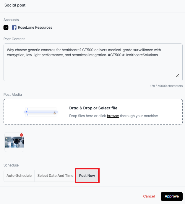 - Click Approve. The post is posted to the nominated social networks. You will receive a confirmation when it's been sent.