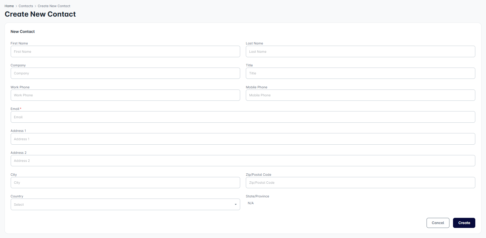 Email Address is mandatory and is used as the unique identifier for the contact. Note: role-based email addresses such as admin@, sales@, etc. should be avoided.